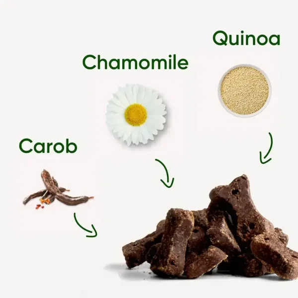 Een kalmerende en ontspannende samenstelling van johannesbrood, kamille en quinoa. Johannesbrood is een gezond chocolade-alternatief dat de zachte gebakken lekkernijen nog lekkerder maakt. Kamille heeft kalmerende eigenschappen en quinoa bevat antioxidanten en eiwitten.