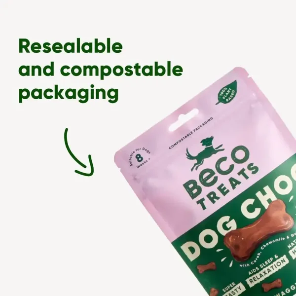 De Beco Treats zijn verkrijgbaar in handige pocket formaat zakjes van 70 gram. De hondenkoekjes zijn volledig duurzaam en worden gemaakt van natuurlijke ingrediënten en plantaardige materialen, zelfs de verpakking is composteerbaar.