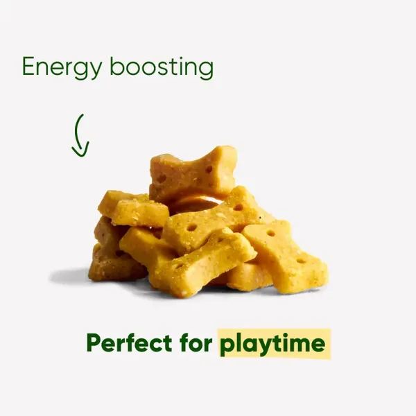 Hondensnacks gemaakt met knapperige pinda's, kurkuma en natuurlijk zoete kokosnoot. Elk koekje wordt zacht gebakken in een oven op hernieuwbare energie en is rijk aan plantaardige eiwitten en smakelijke ingrediënten, waarbij de pinda's een geweldige bron van energie en focus zijn. De hondenkoekjes bevatten geen kunstmatige smaakstoffen, conserveringsmiddelen of kleurstoffen.