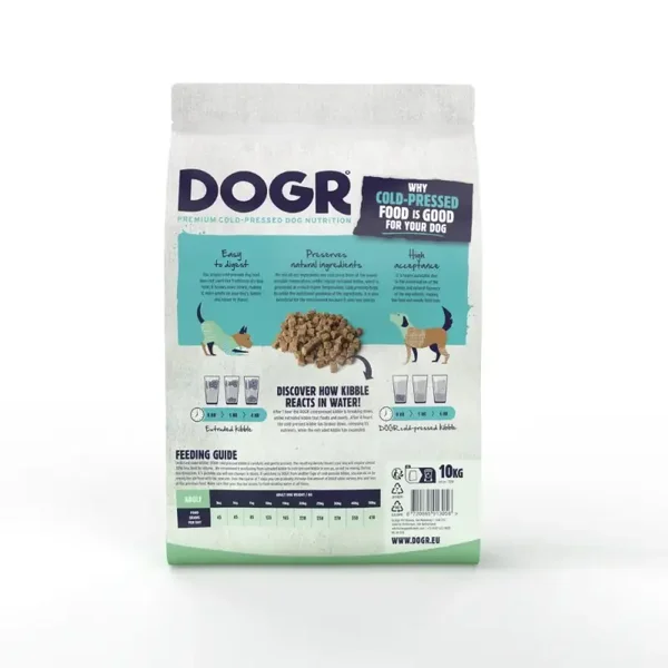 Met een hoog percentage kip of vis bieden DOGR koudgeperste brokken een extra sterke bron van eiwitten. Verrijkt met natuurlijke landbouwproducten voor voedzame koolhydraten en geproduceerd door lokale boeren.