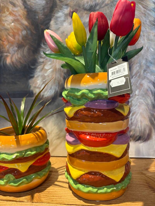 2 hamburgervazen. Incl bloemen en plantje. let op, er zitten kleine beschadigings nipjes in zoals op de foto te zien is
